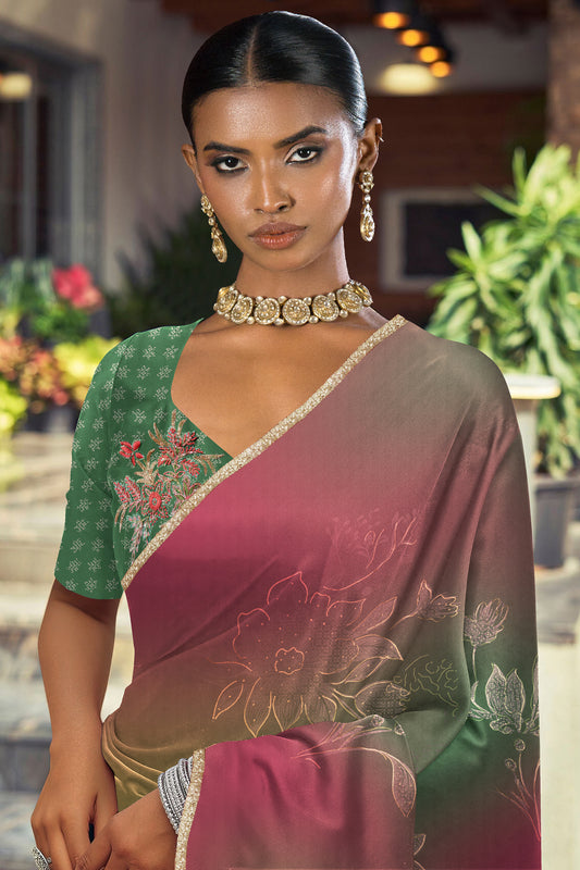 Vantara Luxe Printed Saree - Sage Green Rust Ombre