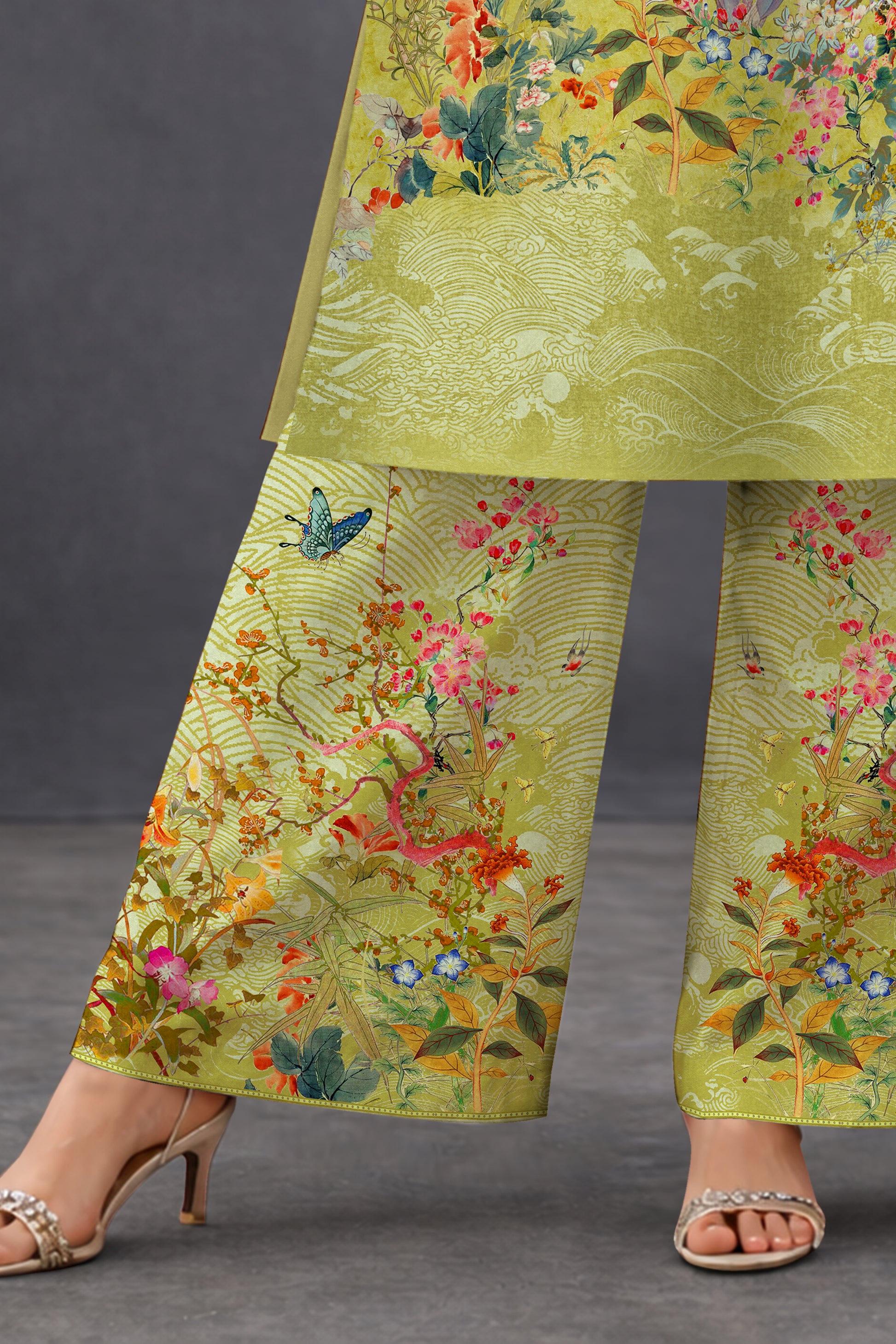 Lime green botanical printed kurta palazzo set with nature-inspired floral and butterfly motifs, round neckline, three-quarter sleeves, matching printed palazzo, and flowing dupatta. Crafted in soft, breathable fabric—perfect for festive wear, daytime functions, and elegant ethnic styling.