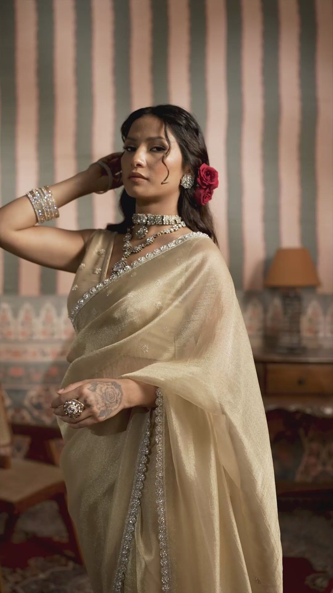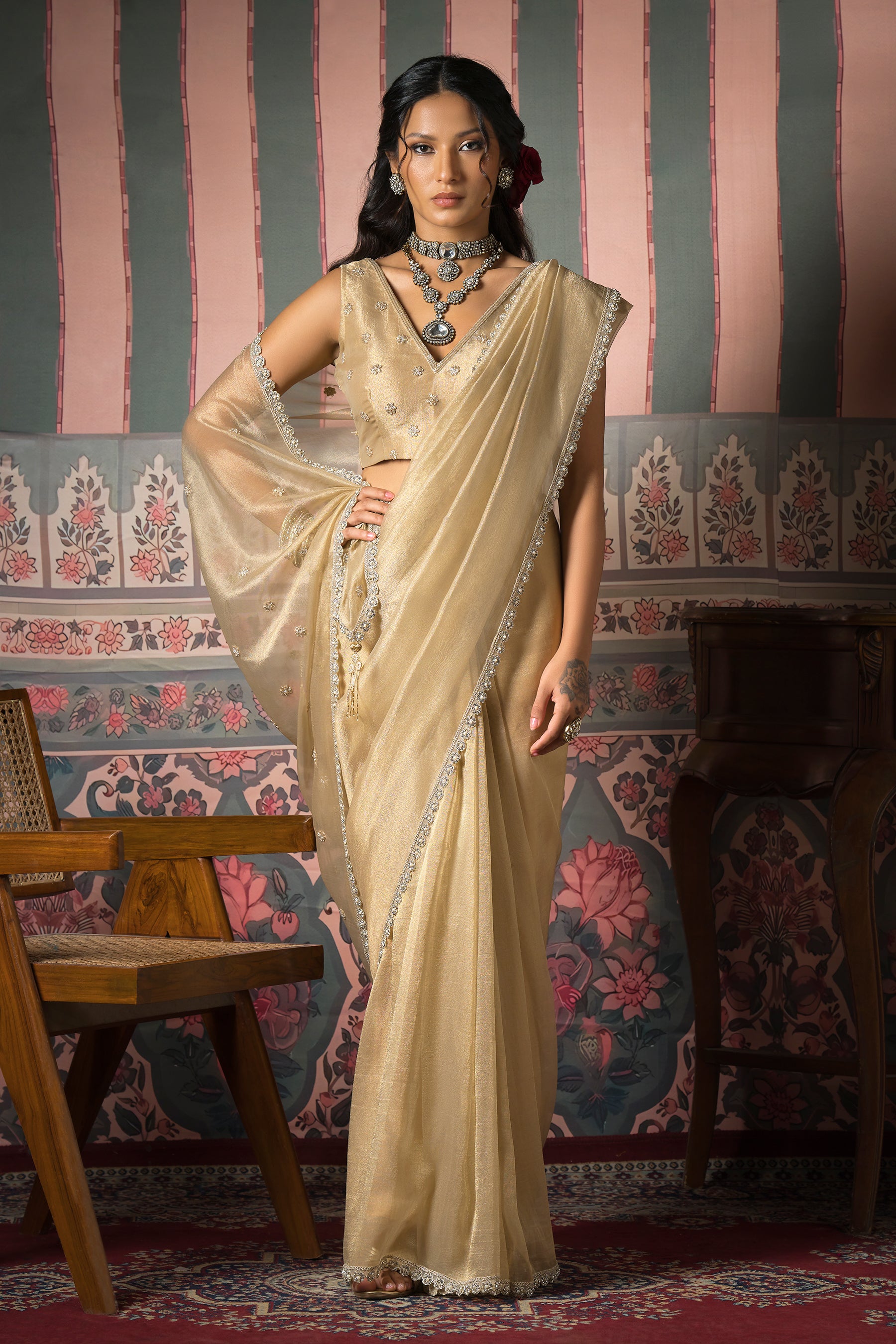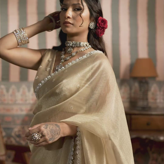 Radiate timeless elegance in this exquisite gold zari organza saree, crafted for sophisticated cocktail evenings and festive occasions. The sheer organza base is delicately woven with shimmering zari threads, lending a luxurious golden sheen.