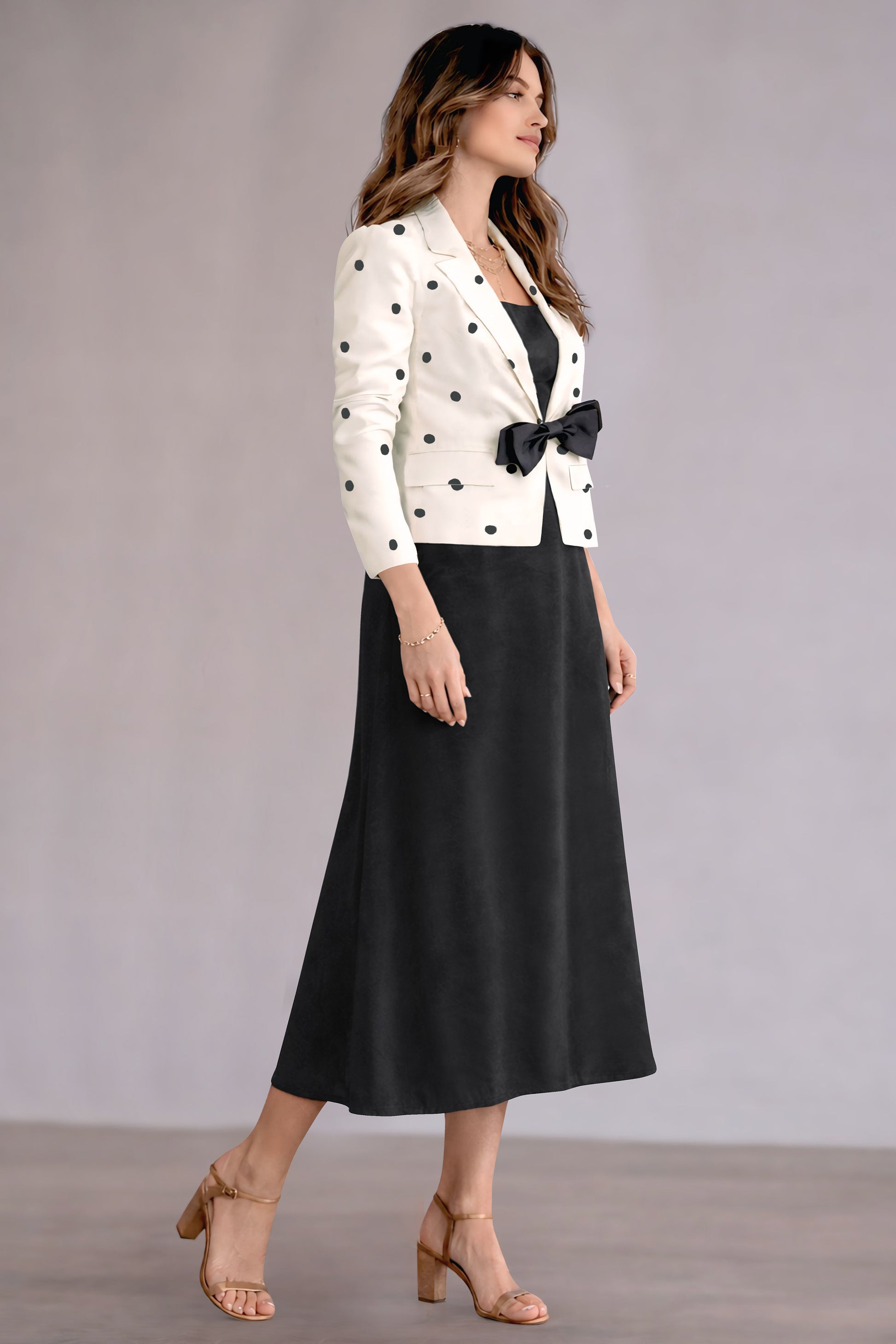 Black Midi Dress with Ivory Polka Dot Cropped Jacket & Bow Detail