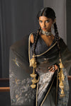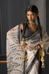 An artistic blend of modern glamour and timeless tradition, this black and white printed saree is elevated with a graceful gold accent that adds warmth and sophistication. Crafted from luxurious tissue matic fabric, it features a soft sheen and fluid drape, giving it a distinctly contemporary appeal.