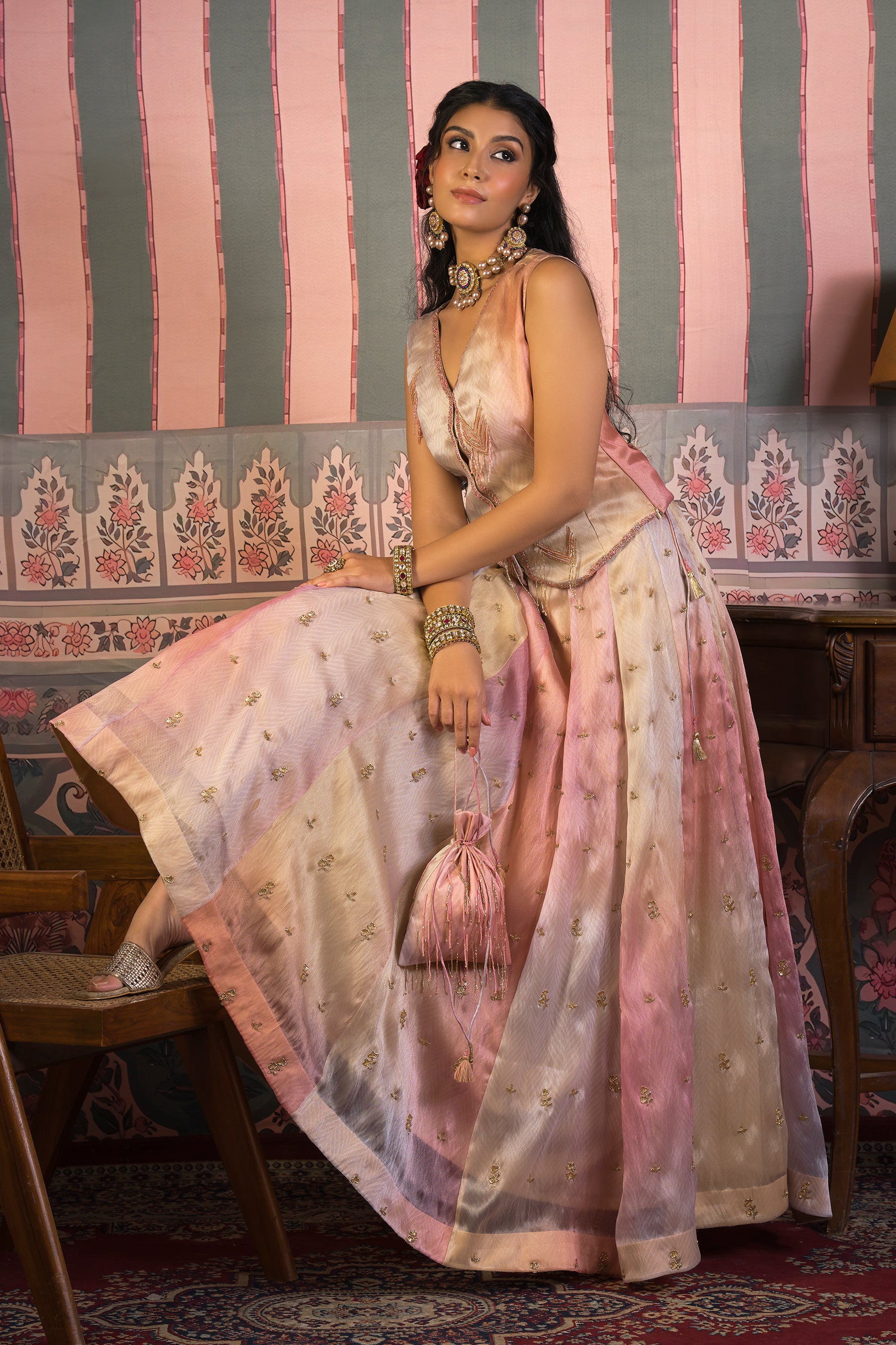This stunning Indo-Western lehenga set is crafted in luxurious silk organza, featuring a beautiful ombre pastel tone that flows effortlessly from soft blush pink to ivory. The ensemble includes a structured waistcoat-style blouse intricately adorned with delicate hand embroidery and beadwork, adding a contemporary twist to a traditional silhouette. The flowing skirt is subtly embellished with scattered handwork motifs, creating a perfect balance of elegance and modern charm. Ideal for festive celebrations, pre-wedding events, or cocktail soirées, this look exudes sophistication and grace.