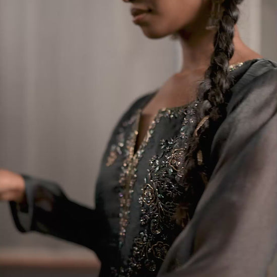 This elegant black printed suit exudes a perfect blend of tradition and modern sophistication, making it ideal for festive occasions, ethnic celebrations, and party wear. The outfit features a beautifully designed heavy yoke adorned with intricate handwork, adding a rich and luxurious touch to the ensemble. The split neckline detail enhances its contemporary appeal while maintaining a graceful ethnic charm.