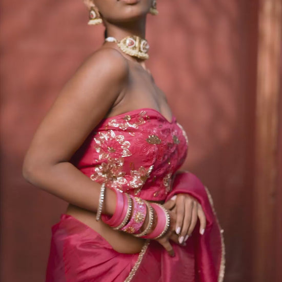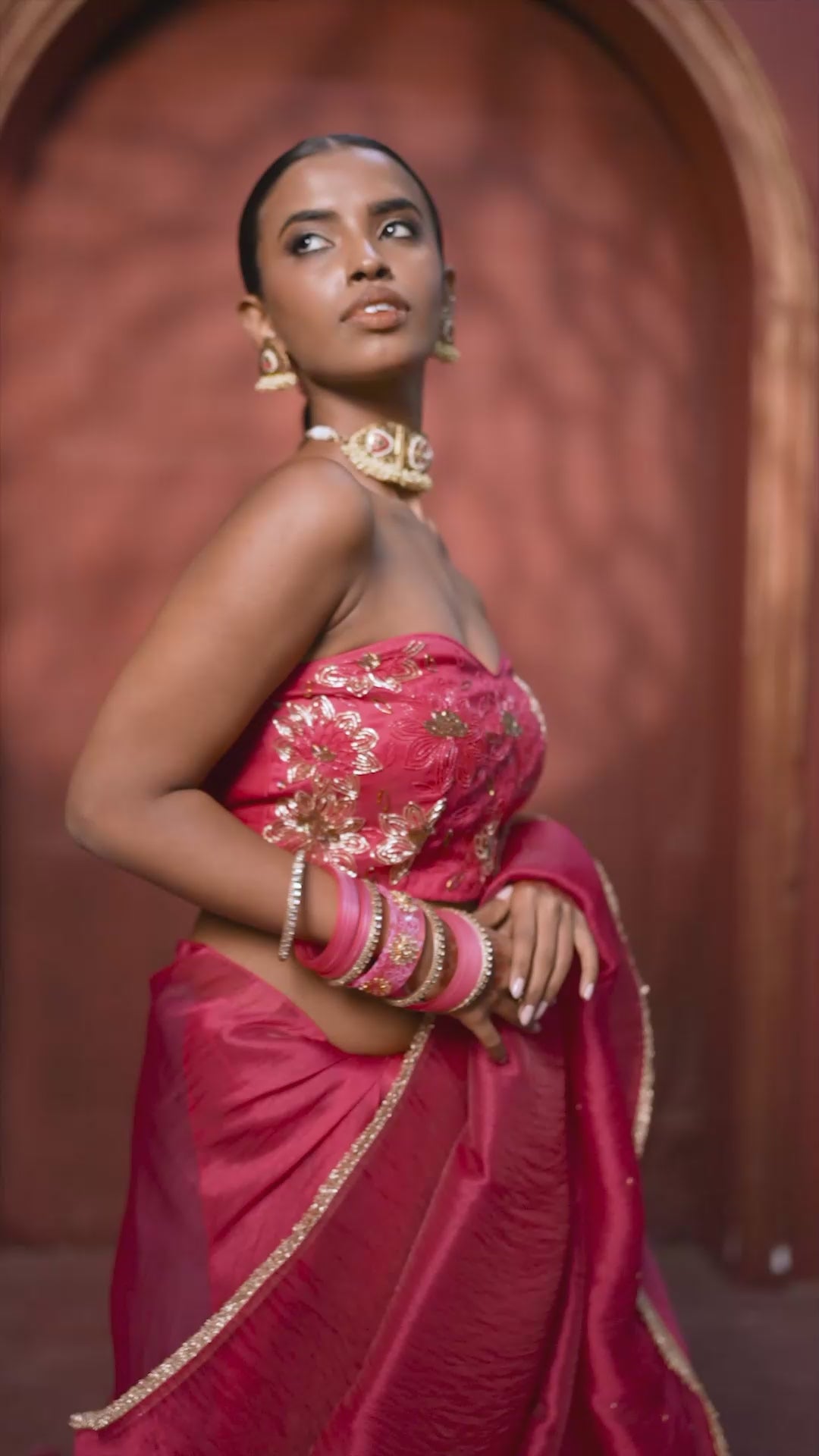 Radiate regal allure in this red silk organza saree, intricately adorned with heavy hand embroidery that exudes timeless craftsmanship. The rich silk organza fabric offers a graceful sheen and fluid drape, beautifully accentuating the saree’s luxurious texture.