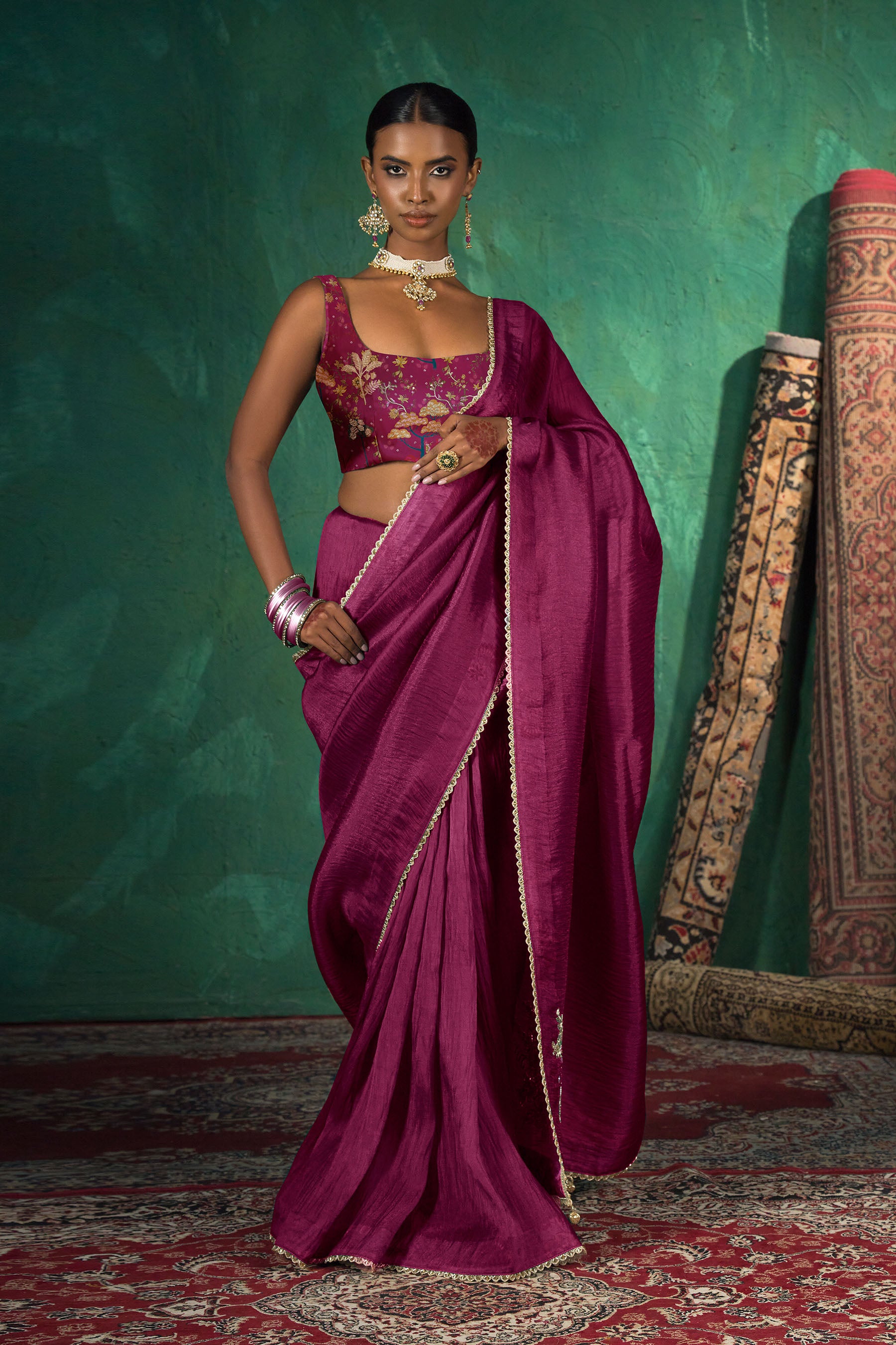 Radiating timeless grace, this Deep Plum organza silk saree features a dyed base with a delicately hand-embroidered pallu. The printed blouse adds a modern artistic flair, balancing tradition with contemporary charm. Perfect for festive gatherings, receptions, or elegant celebrations, this saree exudes luxury with every drape.