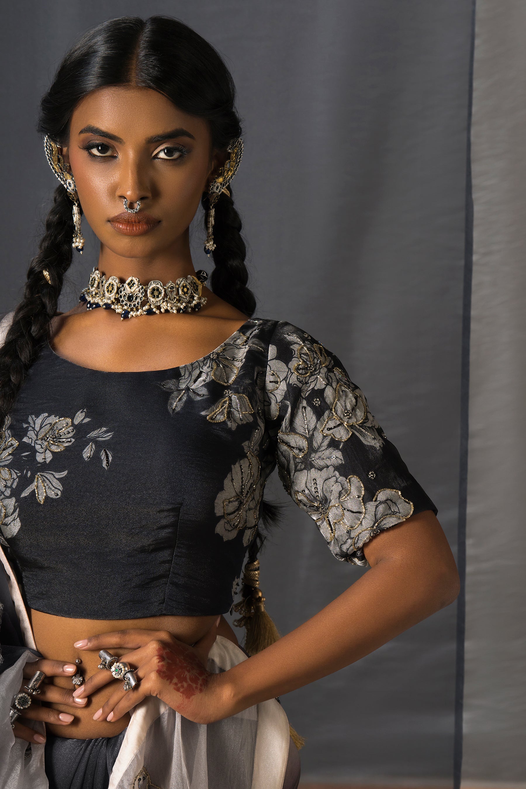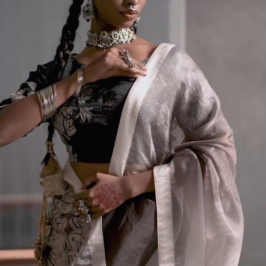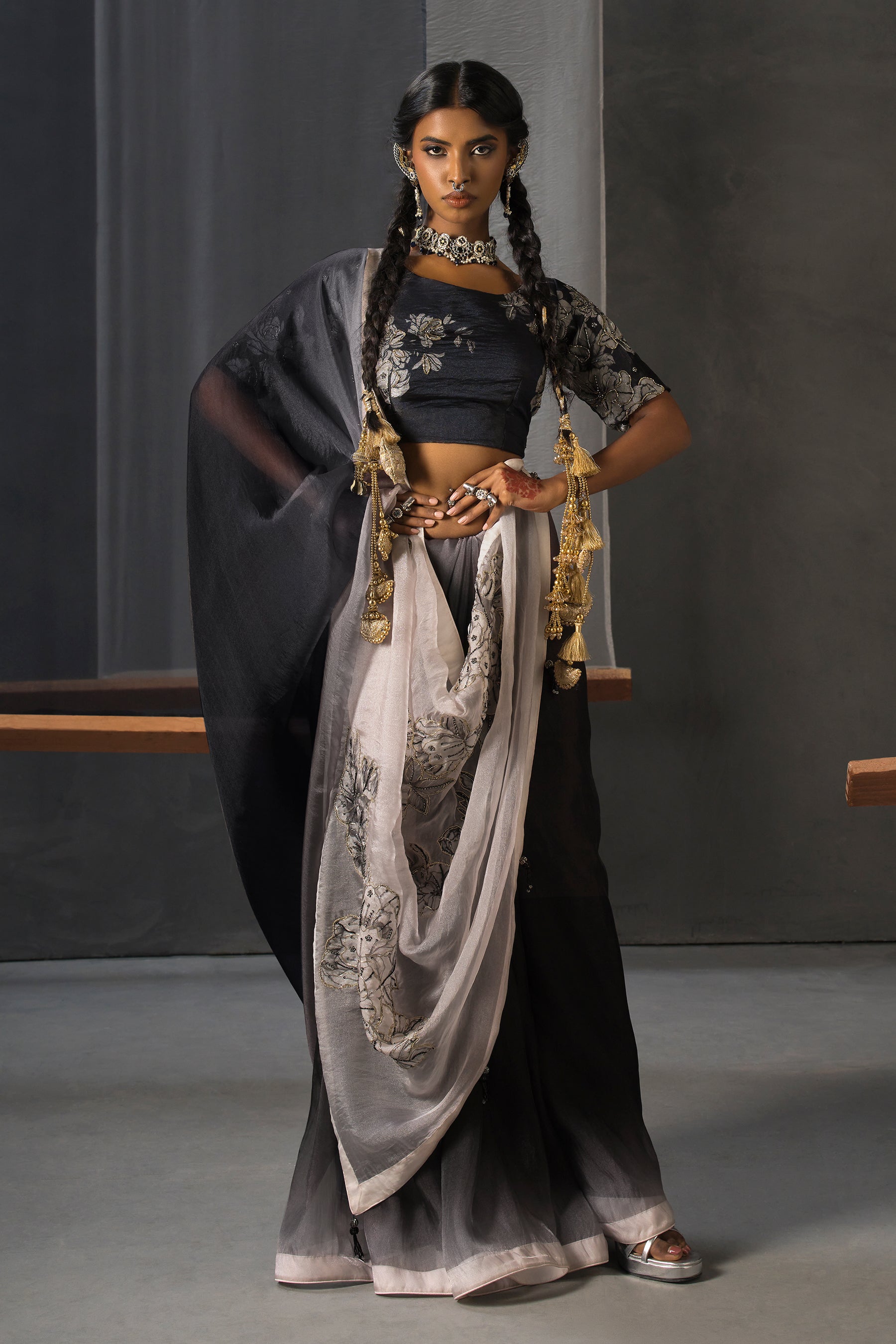 Chic and dramatic, this black and white patchwork saree redefines contemporary glamour with artisanal finesse. Crafted from luxurious fabric, the saree features striking patchwork detailing enhanced by exquisite hand embellishments, adding texture and shimmer to its monochrome palette.