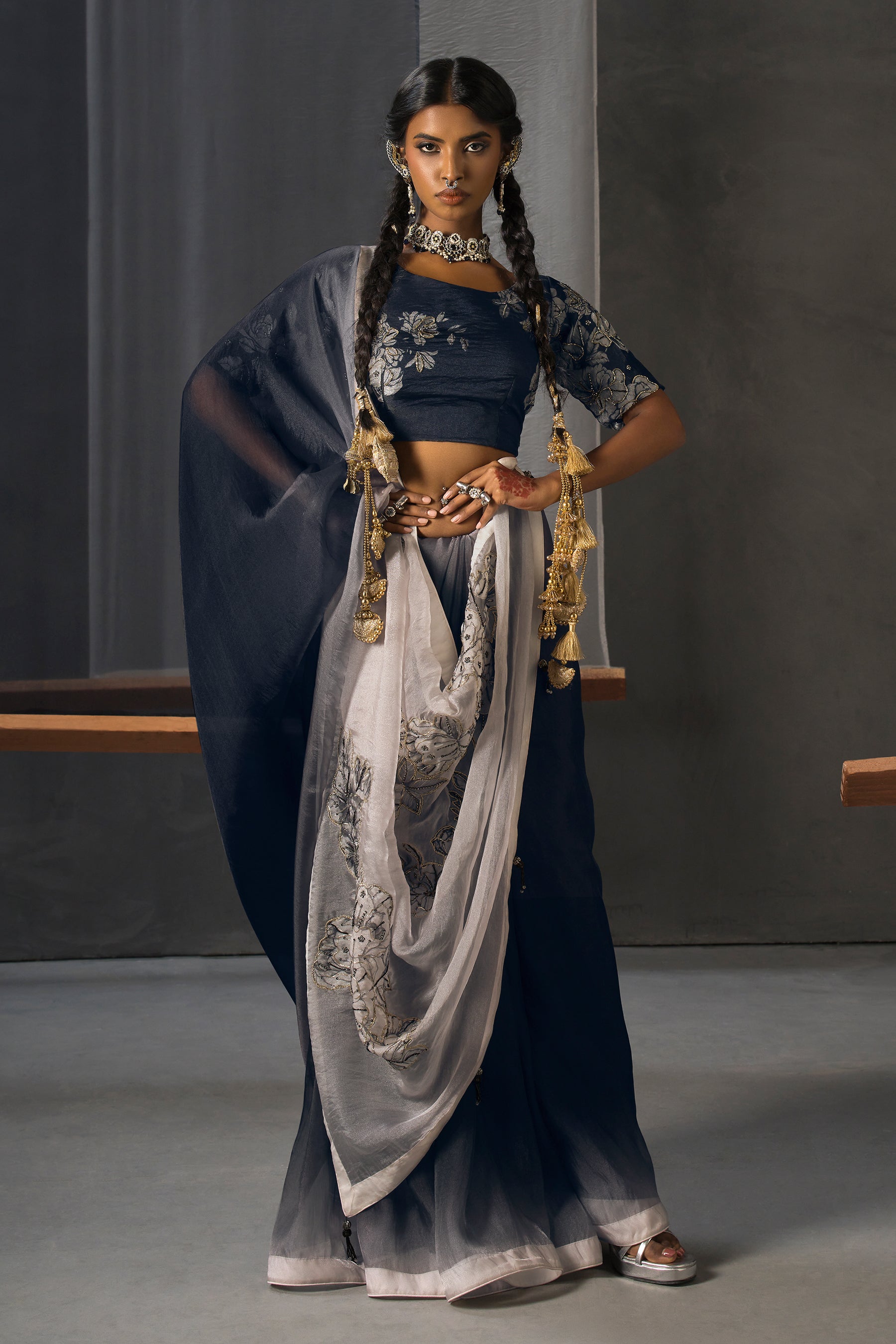 Chic and dramatic, this black and white patchwork saree redefines contemporary glamour with artisanal finesse. Crafted from luxurious fabric, the saree features striking patchwork detailing enhanced by exquisite hand embellishments, adding texture and shimmer to its monochrome palette.