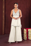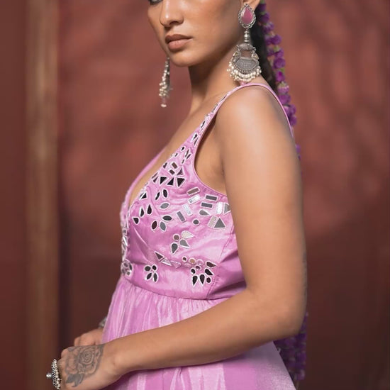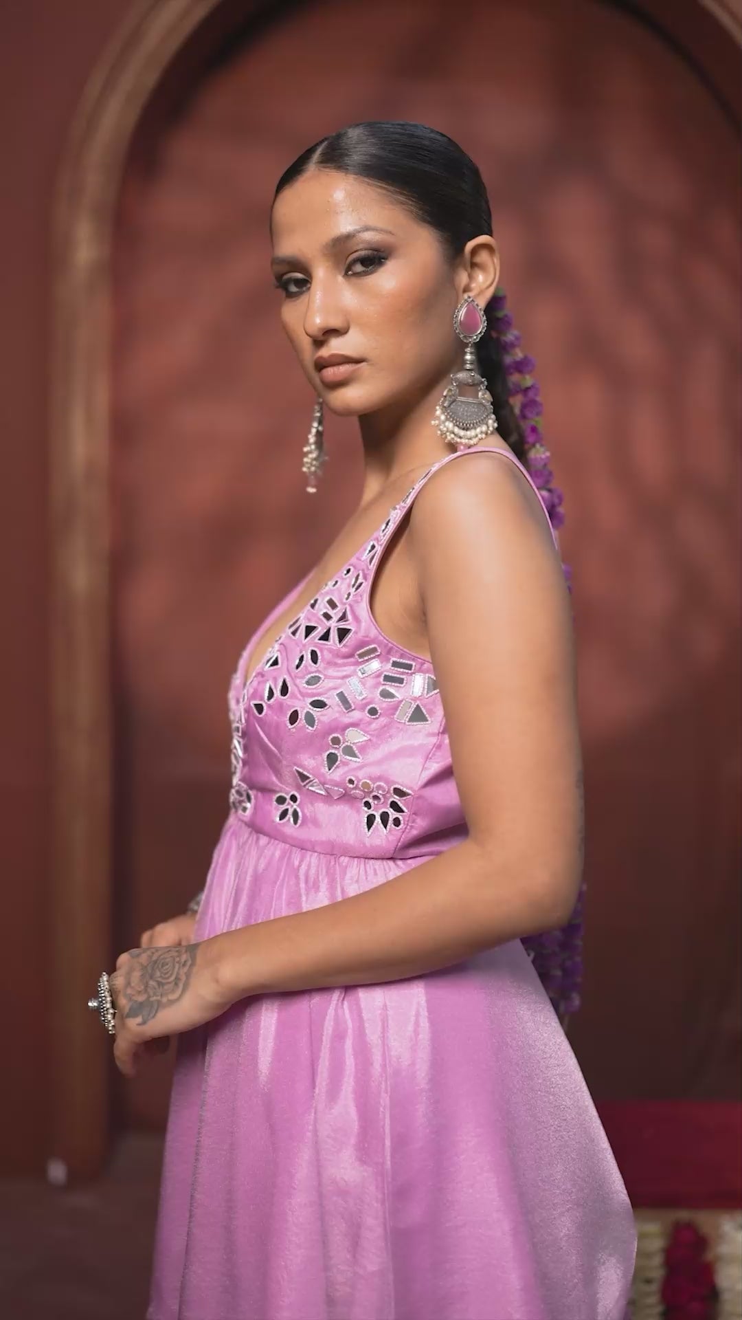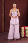 Step into timeless elegance with this exquisite Indo-Western ensemble crafted from luxurious glass silk fabric in a soft lilac hue. The hand-embellished detailing on the sleeveless top adds a touch of sparkle and sophistication. Designed with a front slit, it beautifully blends traditional grace with a modern silhouette. The outfit is paired with flared palazzo pants, offering both comfort and grandeur — perfect for wedding celebrations, festive occasions, and party wear.