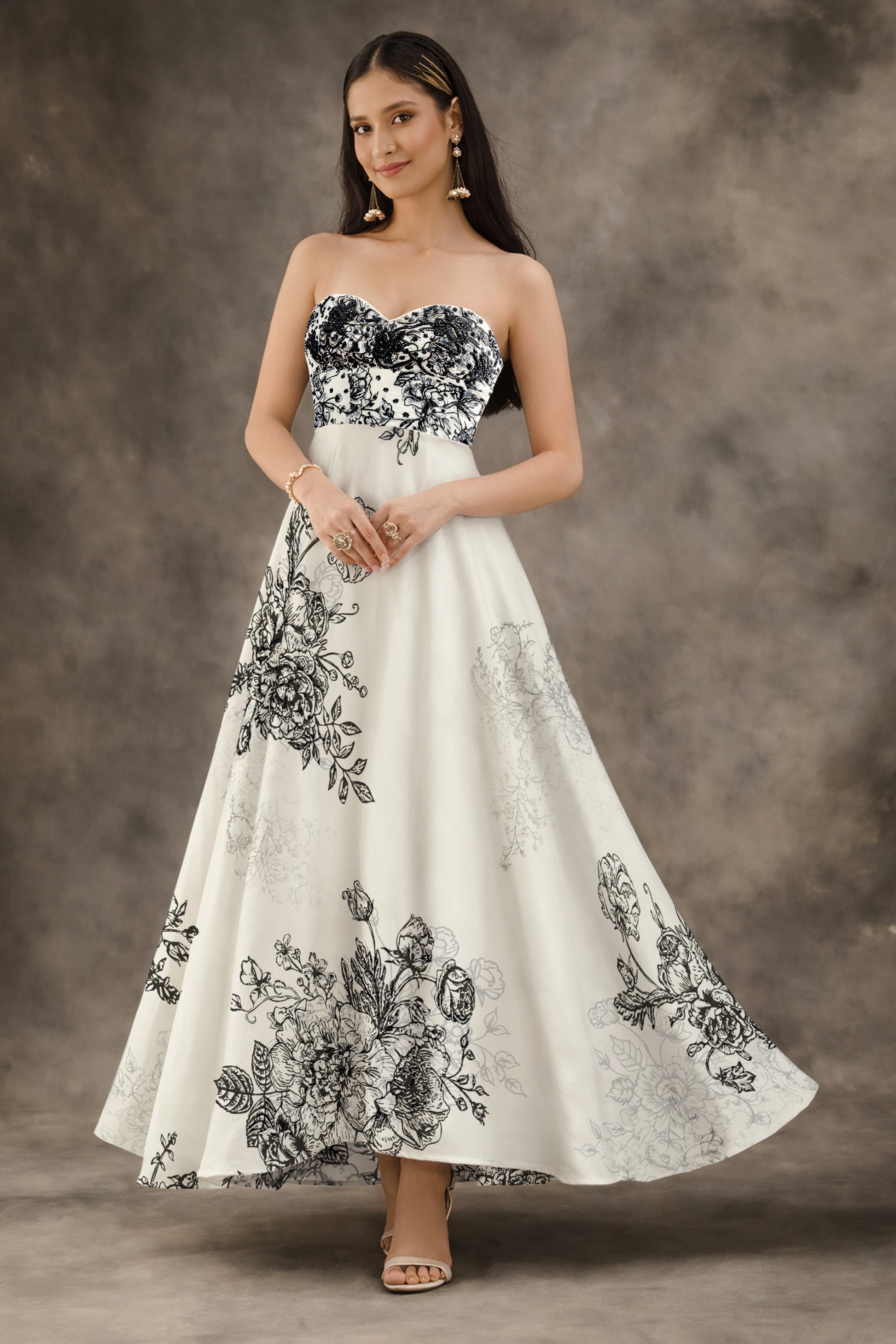 An elegant strapless one-piece western dress featuring a structured, hand-embellished bodice and a flared, flowy silhouette. Crafted on a soft ivory base with striking black floral prints, this contemporary yet timeless design moves gracefully and is perfect for cocktail evenings, resort wear, parties, and destination celebrations.