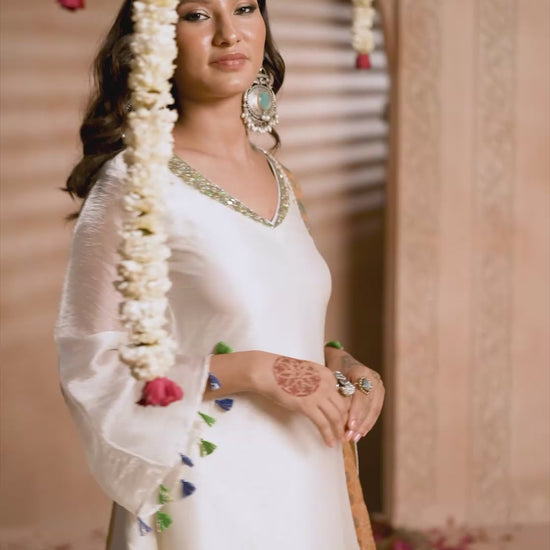 A perfect balance of modern elegance and traditional charm, this contemporary flared top and palazzo set is designed for effortless sophistication. The side-flared silhouette with symmetrical sleeves adds fluidity and grace, while subtle hand embellishments elevate the look with a touch of festive shimmer. Paired with a contrasting Bandhani printed dupatta in earthy tones, this ensemble makes a refined statement for parties, festive events, and elegant soirées.
