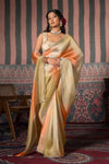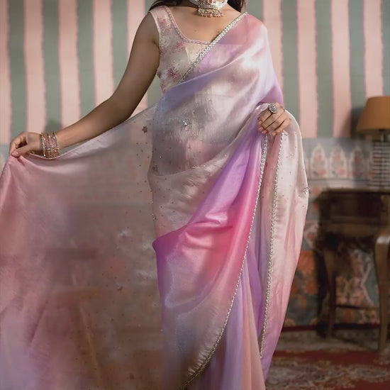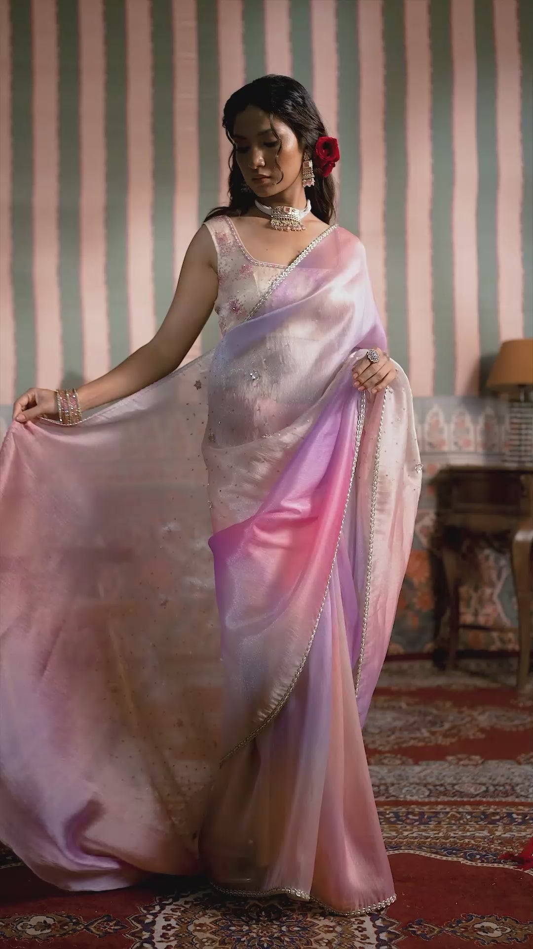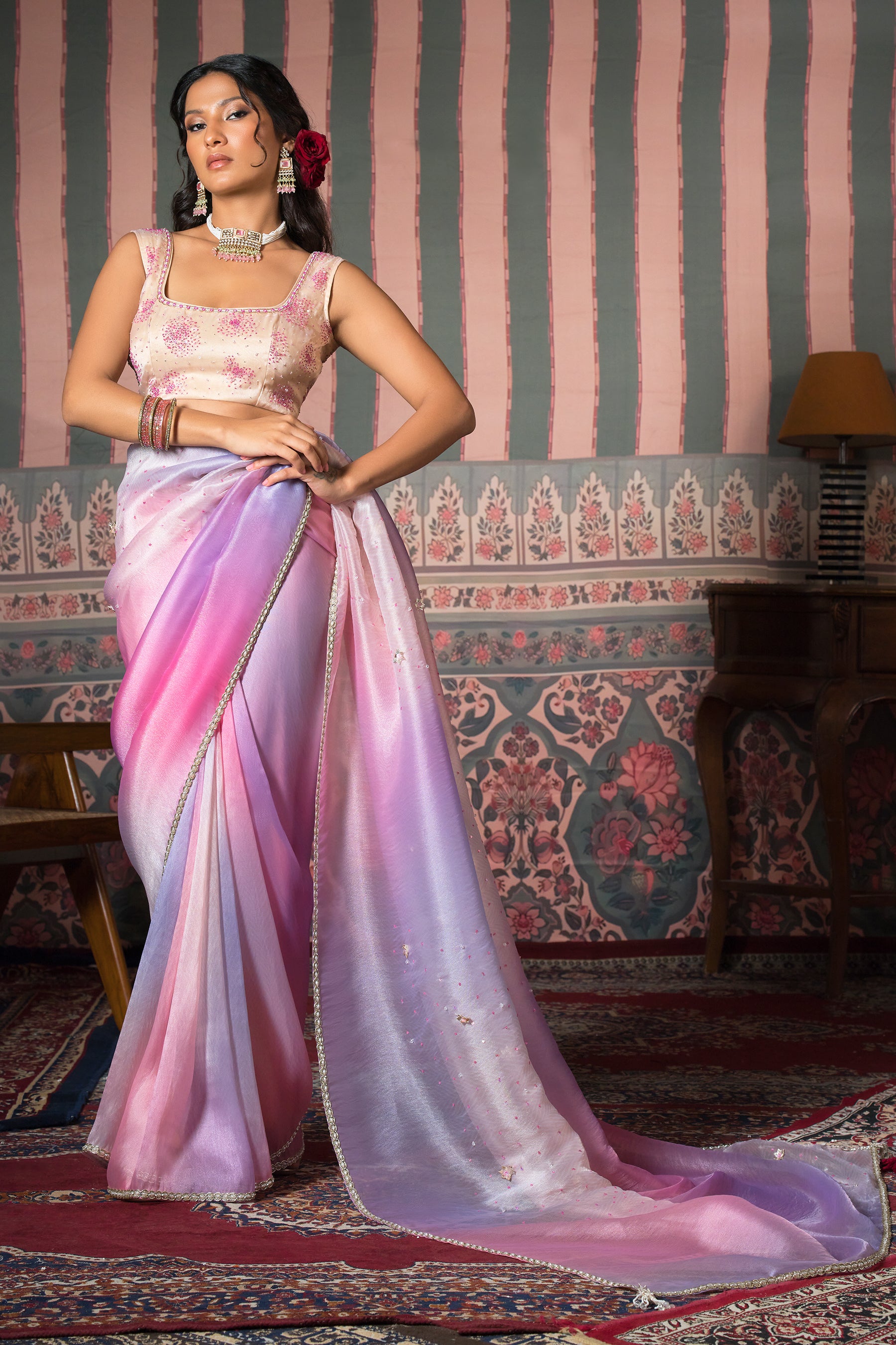 A stunning play of hues, this multi-color spray saree in pure silk organza celebrates artistry and grace. The fluid organza fabric features a dreamy blend of soft pastel tones — merging lilac, rose, and sky hues in a luminous gradient.