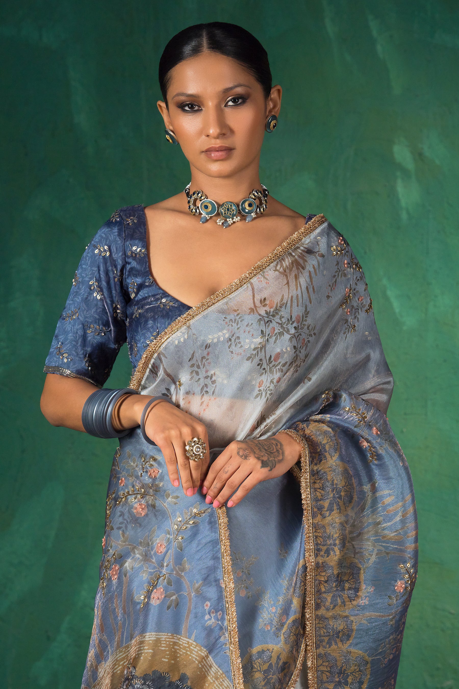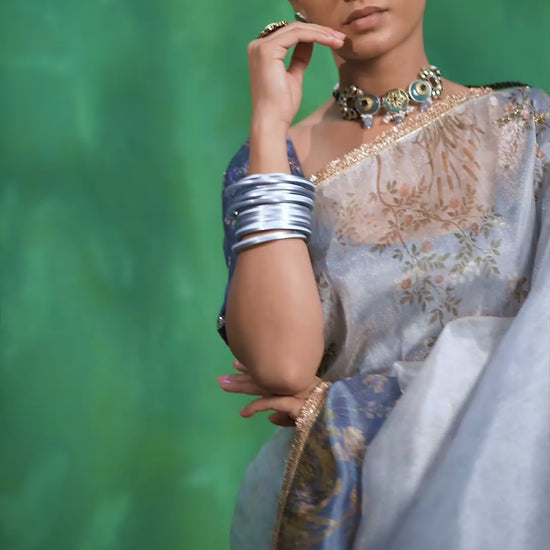 A regal masterpiece blending art and craftsmanship. This Tissue Matic saree features an exquisite Vantara-inspired print, enriched with delicate hand embroidery for a luxurious touch. The fabric’s soft shimmer and smooth drape make it perfect for festive occasions, weddings, and grand celebrations. A statement piece that beautifully bridges traditional elegance and modern sophistication.